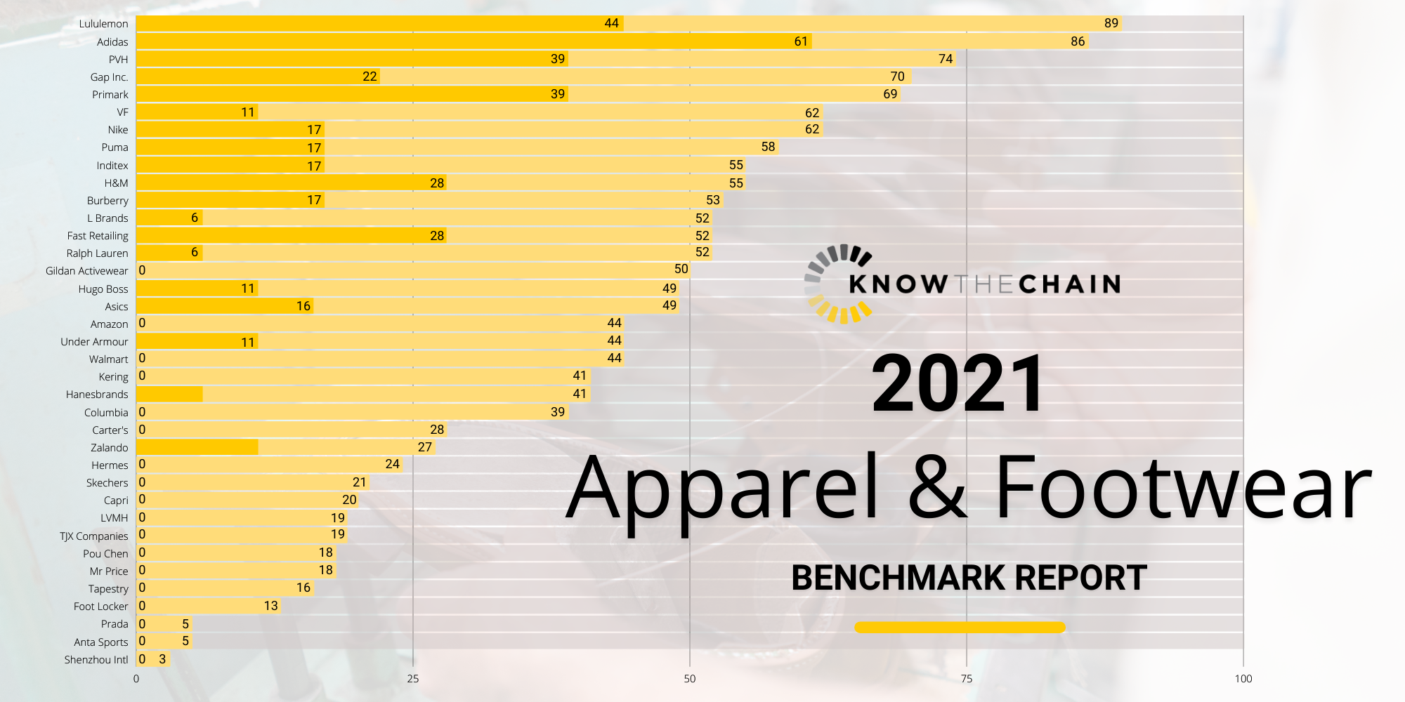 - Lululemon (89/100), Adidas (86/100) and PVH (74/100) are at the top of the benchmark, while ten companies, including Luxury brands like Prada and Tapestry (owner of Coach and Kate Spade) score 20/100 or less.