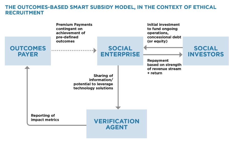 What if a “smart subsidy” were paid to recruitment firms who could prove that they had not charged workers fees? Workers placed by the recruiter could provide feedback—potentially via anonymised technology—on whether or not they had paid fees, and if it were confirmed that a recruiter had meaningfully shifted business models towards an “employer-pays” model, they would be eligible for outcomes payments. Working capital to enable this shift might be provided by social investors: together, the different revenue streams could help to grow the ethical recruitment market while ensuring a rigorous focus on quality.