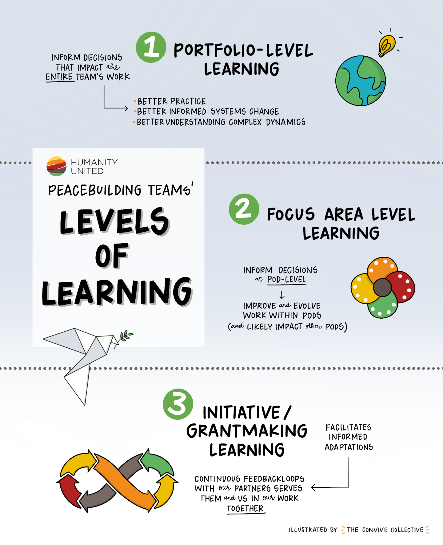 - Learning at the focus area level will inform technical decisions and improve the work of the team within our four thematic areas: Agency for Collective Action, Innovative Pathways for Peace, Inclusive Peace Processes, Healing and Well-Being, and Country Approaches. This learning level will also examine how our partners are contributing toward each specific focus area.